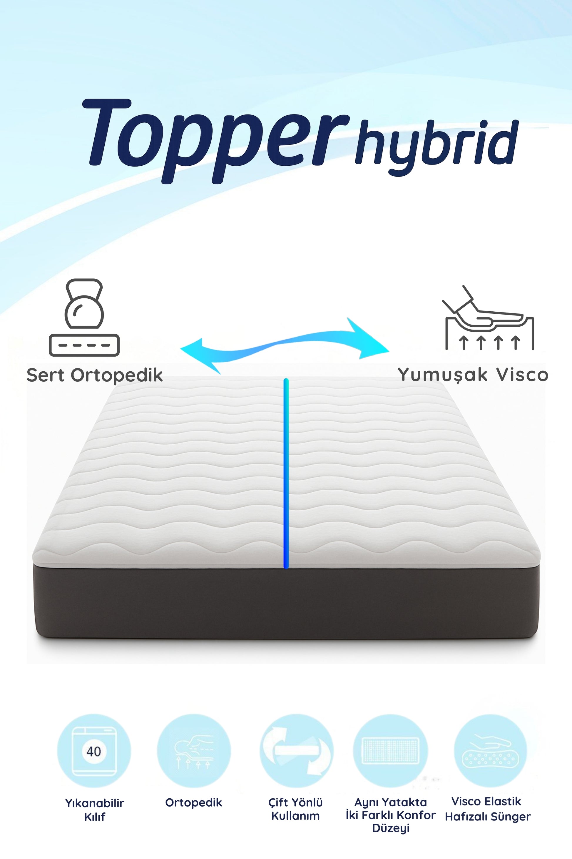 - Bir tarafınızda ortopedik sertlik (mevcut sert Topper 3.0'dan ilhamla), diğer tarafınızda yumuşacık, saran hafızalı visco konforu (mevcut soft visco modelimizden)